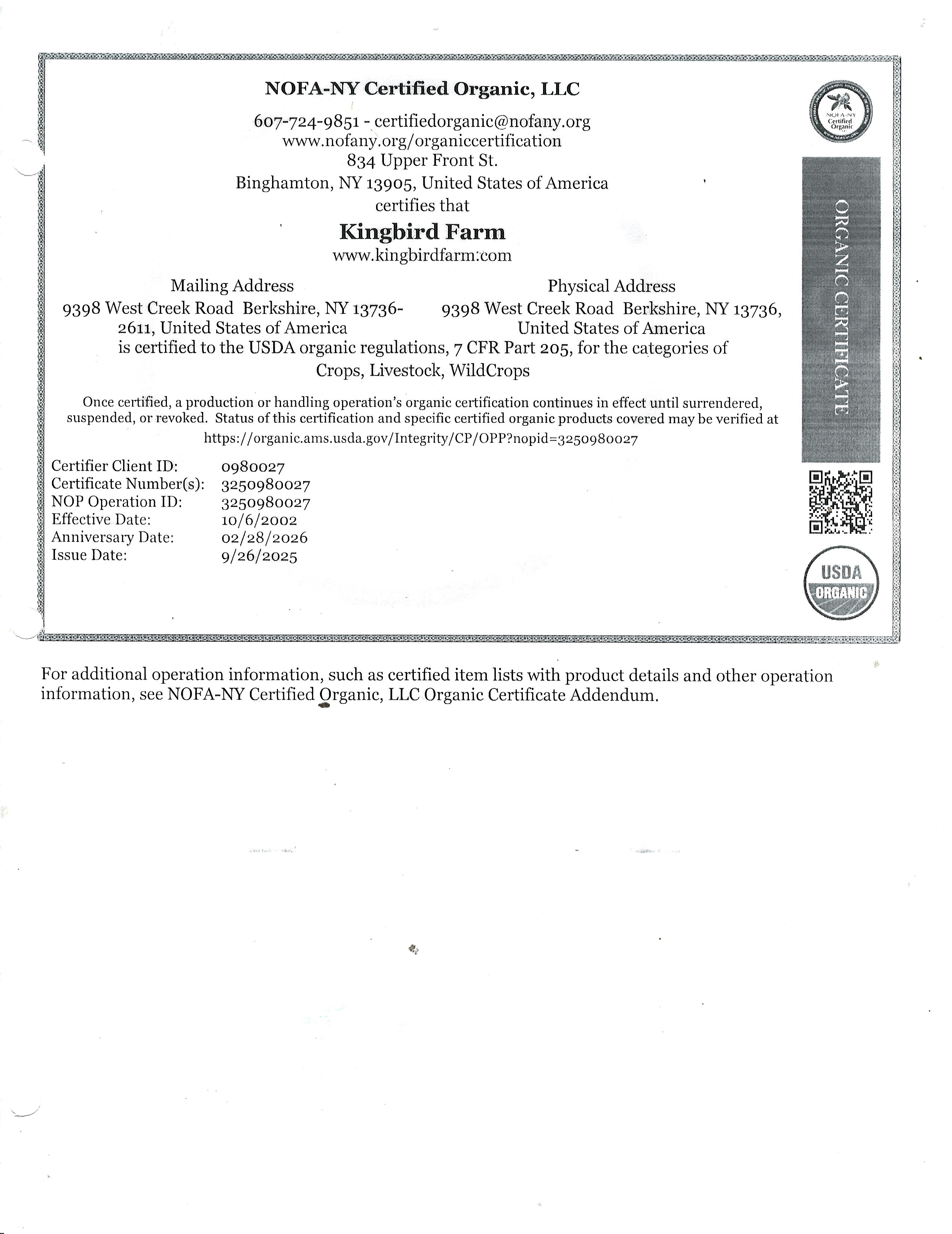 We are proud to be certified third-party inspected by NOFA-NY for organic practices and AWA for animal welfare. In addition we are certified by The Real Organic Project which adds further integrity to our organic methods. We urge our customers to educate themselves about certification and determine which standards have value to them.